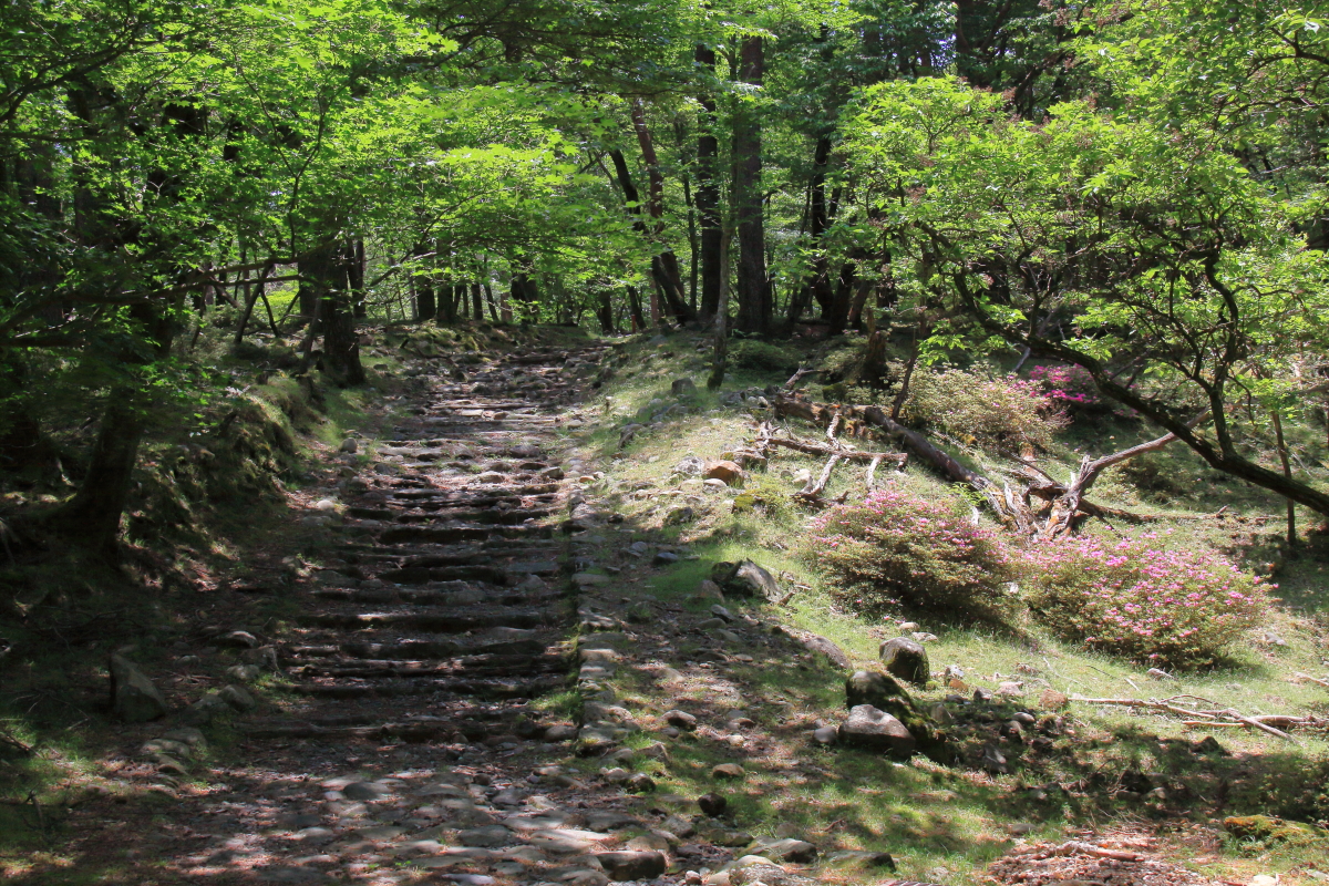 なだらかな登山道も此処で終わり石段を少し登ります 不動の池は近いです |