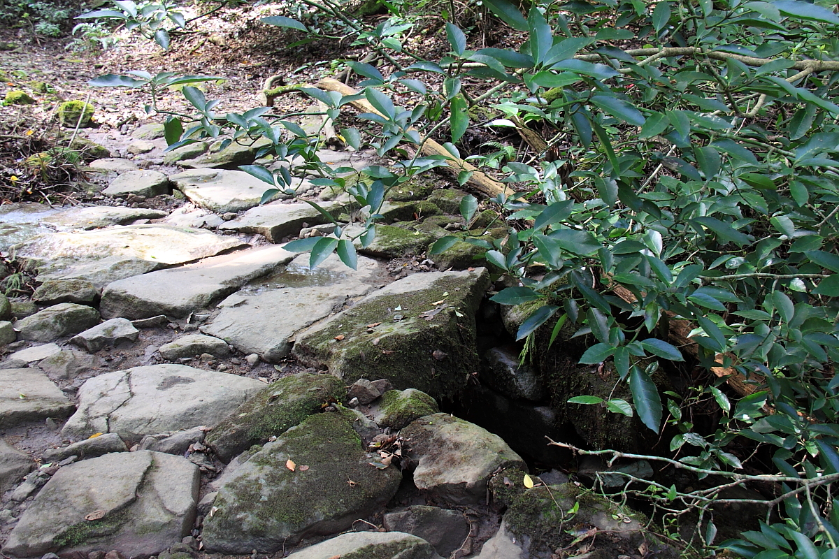 *(7-3)石畳 此の辺りの急坂の右側は急斜面で下方に小川が 暫く歩くとこの小川が同じ高度になってきます |